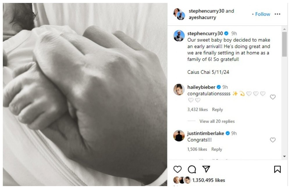 “Our sweet baby boy decided to make an early arrival!! He’s doing great, and we are finally settling in at home as a family of 6! So grateful! Caius Chai 5/11/24,” Stephen wrote on Instagram on May 26.