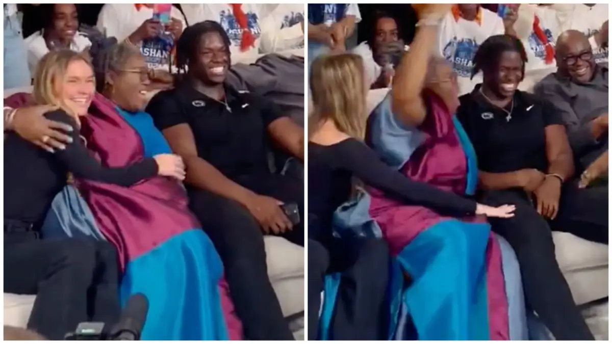 “The New York Jets,” said the draft pick as he shared the news. The room cheered and Fashanu’s mom gave him a big hug. His girlfriend also congratulated him by reaching over and placing her hand on his knee. At the same moment, Paige Fashanu raised her arm to continue cheering, thereby blocking the unidentified young blond woman.